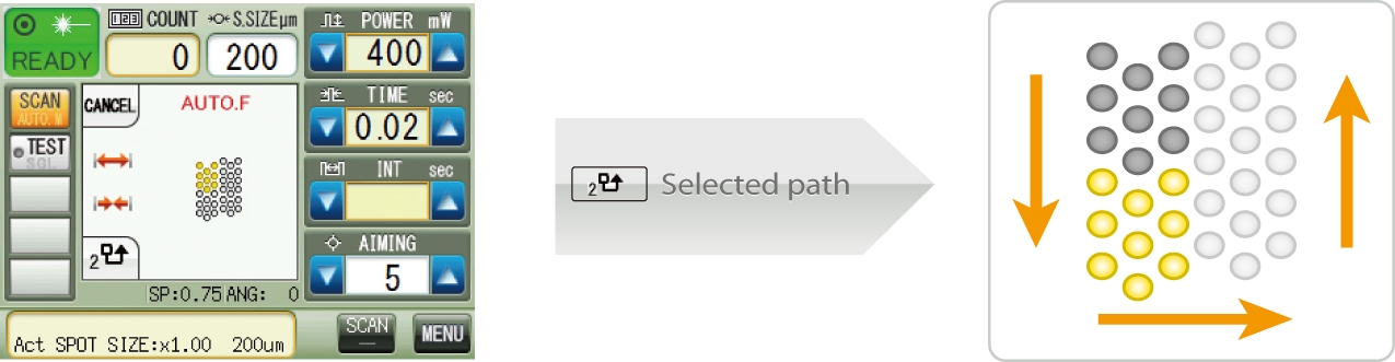 El modo de repetición con la función de avance automático permite que regiones consecutivas se sometan a fotocoagulación en una ruta preprogramada presionando y manteniendo presionado el pedal.