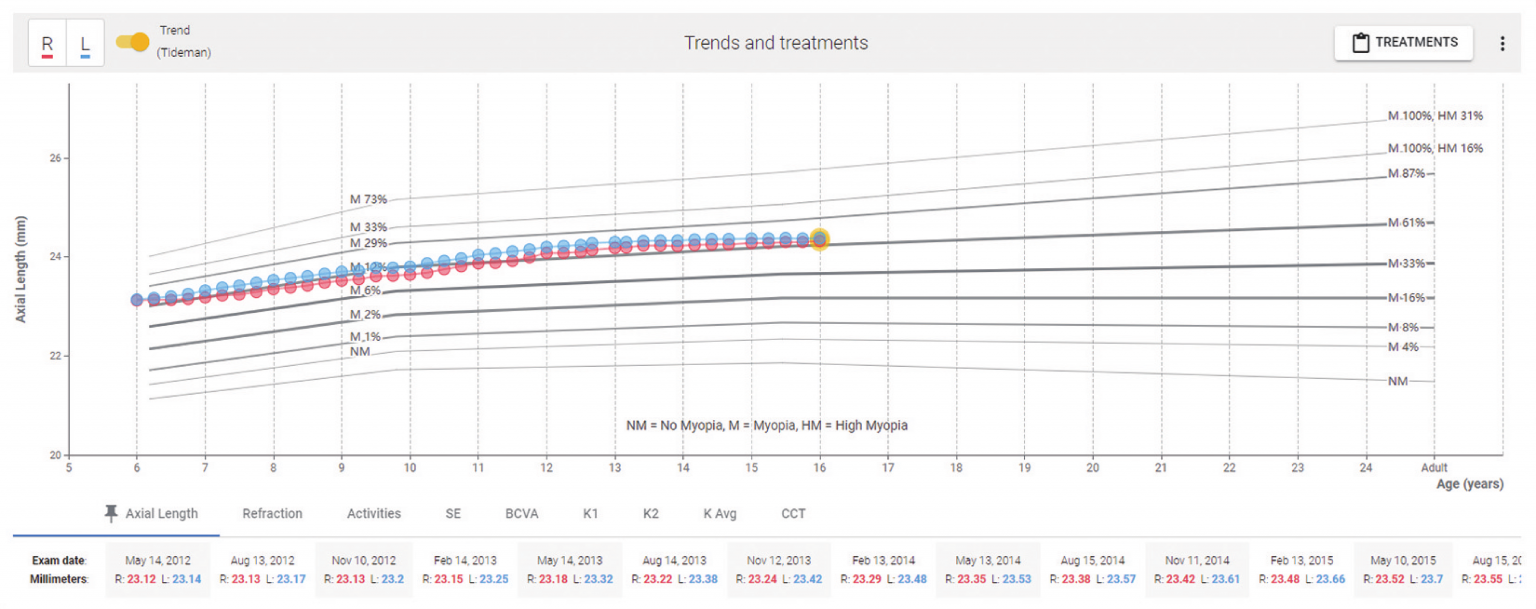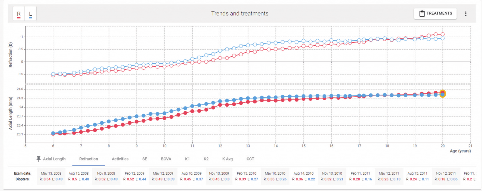 Las mediciones a lo largo del tiempo se pueden monitorizar y comparar con la curva de crecimiento*. Además, el software MV-1** Myopia Viewer presenta el historial del tratamiento y el comportamiento del paciente en un práctico resumen. El historial es importante para la toma de decisiones clínicas y las pantallas intuitivas son útiles para la educación del paciente y sus padres.