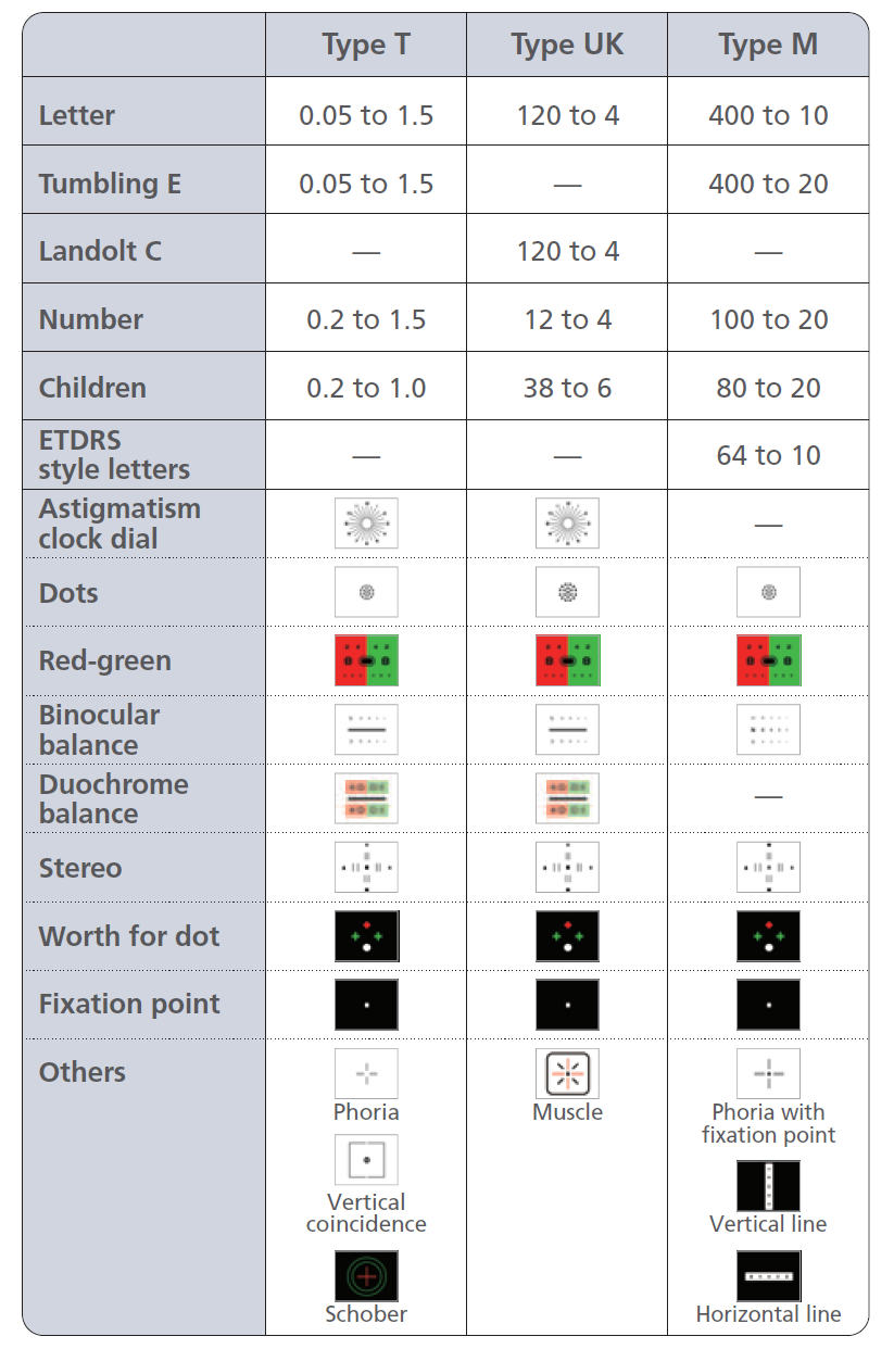 El sistema óptico integrado cuenta con optotipos en la parte posterior de la ventana de optotipos para realizar un examen de corta distancia equivalente a la distancia de refracción estándar.